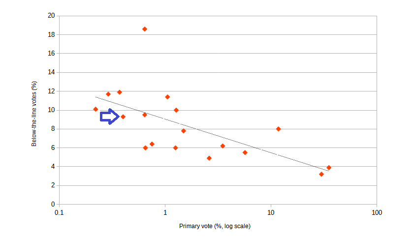 What’s interesting about Green’s analysis is that federally, with no GVTs, that ideological correlation mostly disappears. I made a graph showing the relationship between a party’s share of vote and the proportion of its vote that’s below the line; the trend is clear, and the Libertarians (marked with the arrow) are only just below the trend line. (The one serious outlier is the Trotskyists, up the top with more than 18% below-the-line.)